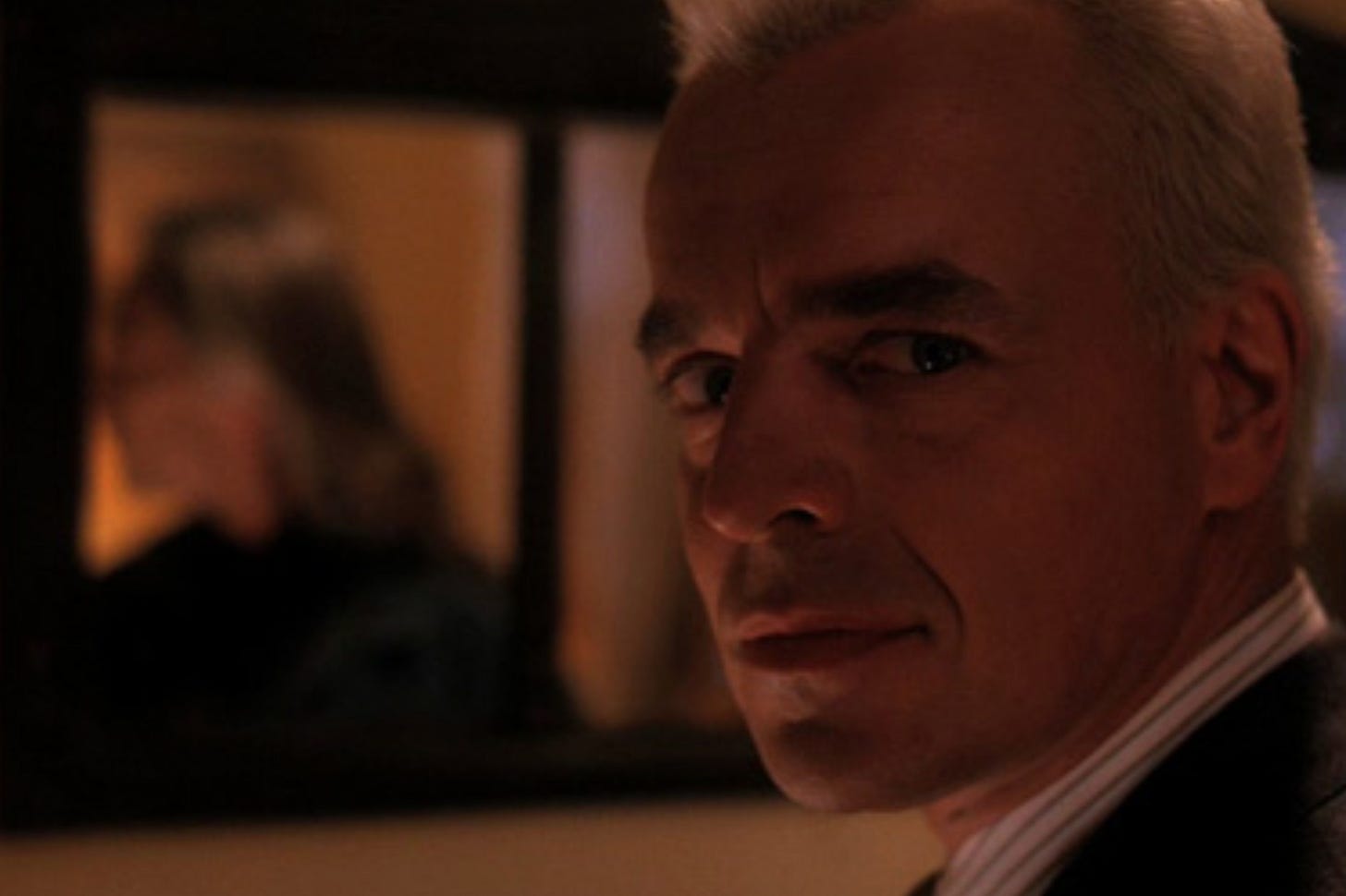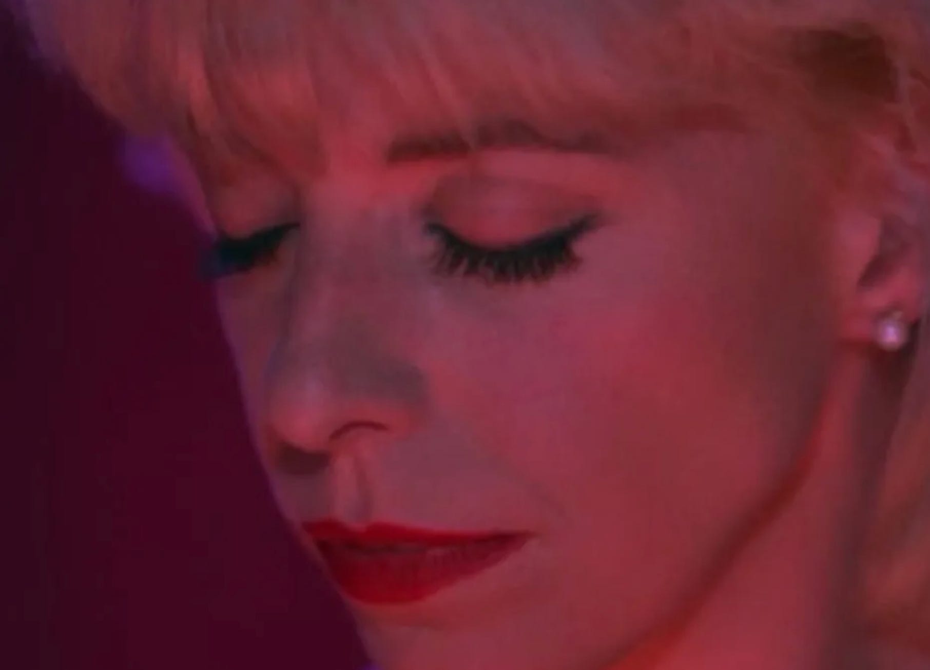 The camera trails along Sarah’s prone form and rises up to meet her husband, Leland, his hair a shocking white, stood tall and straightening his tie in the mirror, seemingly oblivious to the incapacitated figure at his feet. The drone fades and we’re at the Roadhouse (the neon sign reflected in a grimy puddle, another magnificent Lynch shot) and Julee Cruise is on stage singing to the patrons. Seems that we’re going to get the full works tonight.