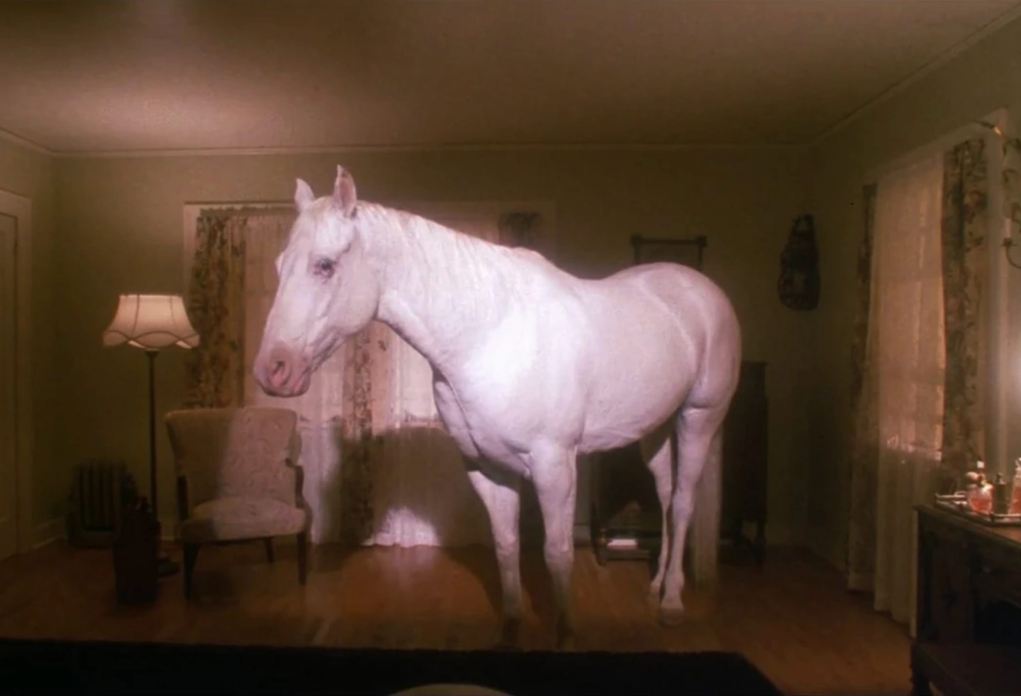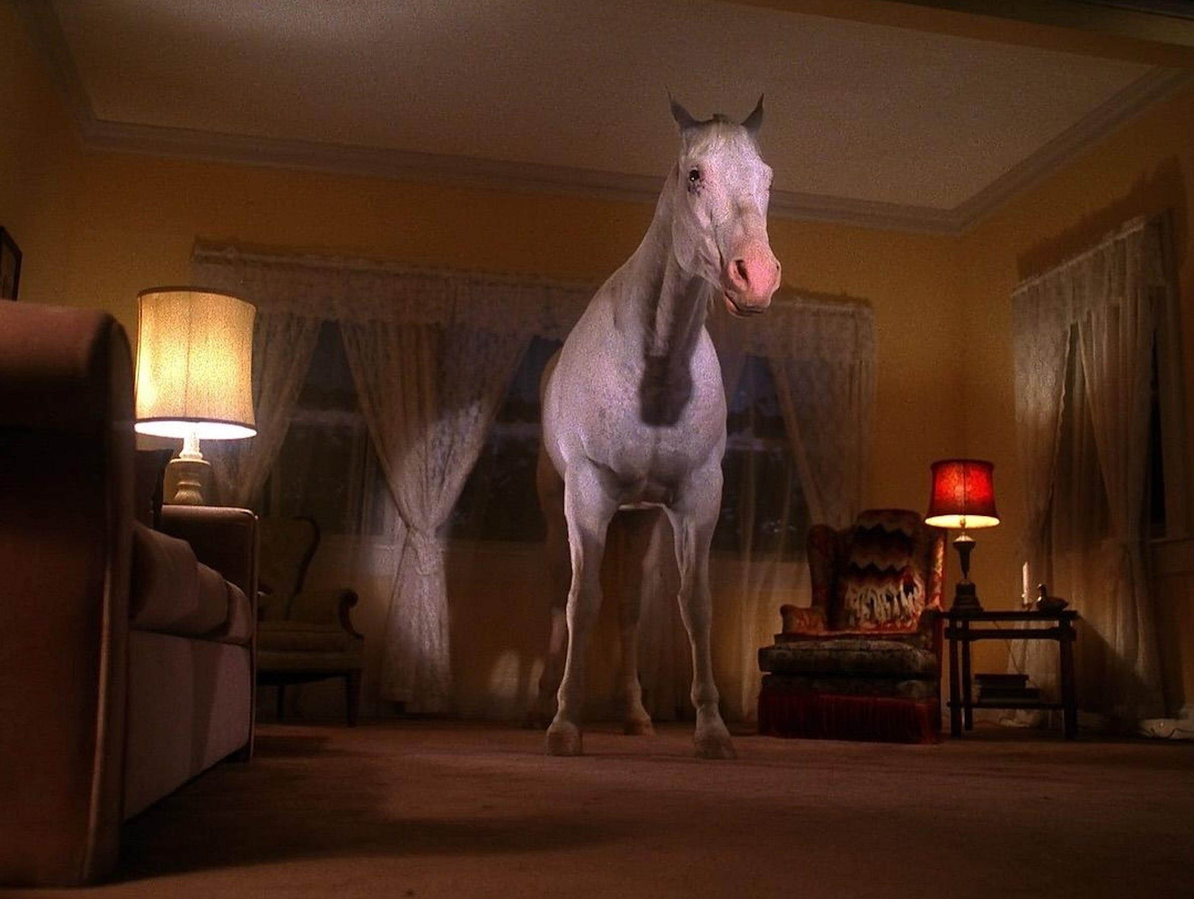 A shot of a tree rustling in the wind cuts to an empty living room (always an ominous sign with Lynch), a low synth drone from Badalamenti (the shovel-maker) and the dead click of Louis Armstrong repeating on the phonograph. An empty chair (the master of the house is absent, a neat foreshadowing as Leland Palmer is about to be possessed by the murderous BOB). Unusually, the camera backs away from the vacated chair at ankle height, turns, and who is this crawling down the stairs, misshapen and whimpering, groaning under the turning overhead fan?