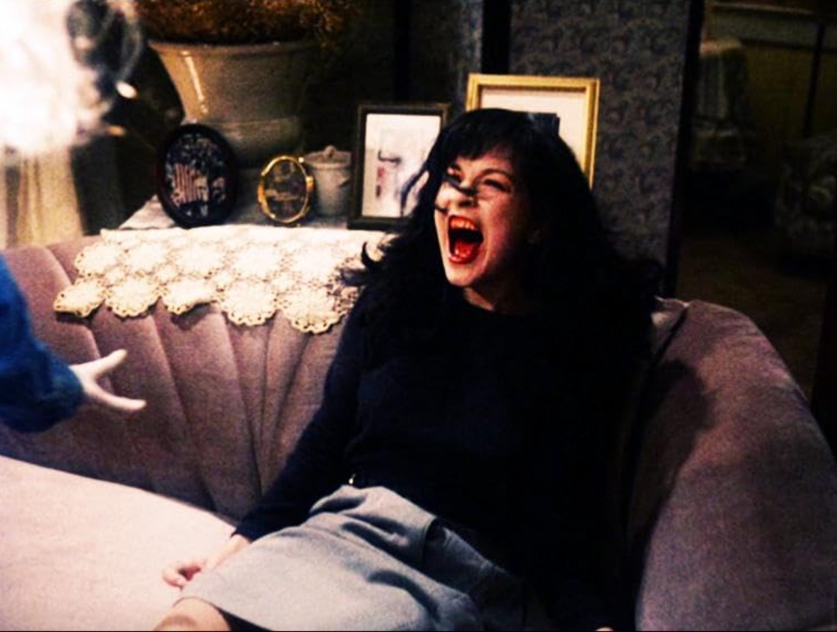 Maddy’s murder is in three acts. Extended, and awful. Almost unbearable. She’s chased down and dragged back into the living room. Brightly lit and unsparing, unlike the strobe-lit killing of her cousin Laura in the darkened railroad car, this is murder upfront and clear to see, broadcast in the front room of the Americans. Strangulation and screaming. Terrible screaming. A hard punch in the face. BOB is grinning as he tortures Maddy, deaf to her pleas. He’s revelling in it. The soundtrack is slowed down to the pitch of desperate animal groans. BOB slow-motion waltzing with Maddy in her final moments. He throws her to the couch, she’s sat upright, and we zoom in (noting the perfect cut of her skirt) on the scream (the scream that joins every other scream; you sometimes feel that cinema was solely invented to capture scream after scream, the defining image of tormented humanity); a very hard cut to Leland punching down hard into that scream. Once. Twice (pause for breath).